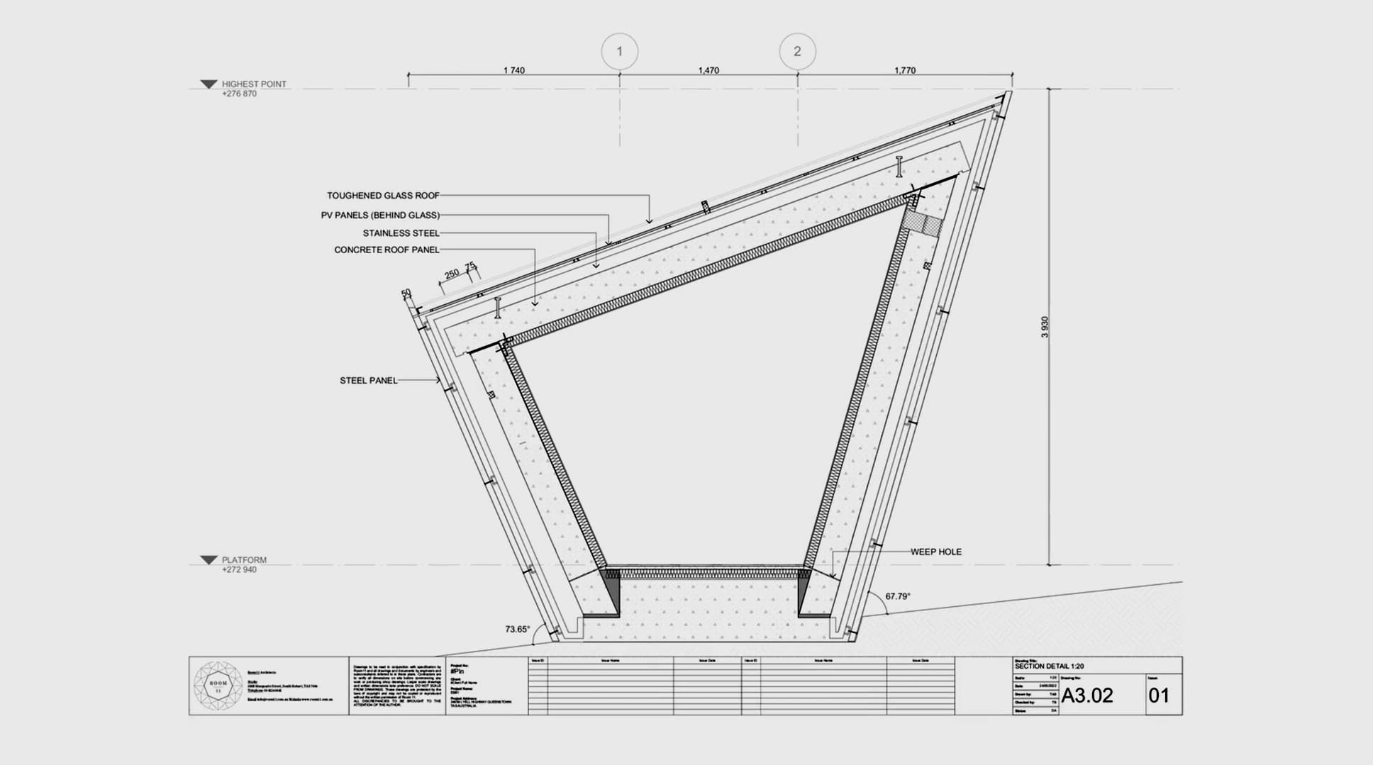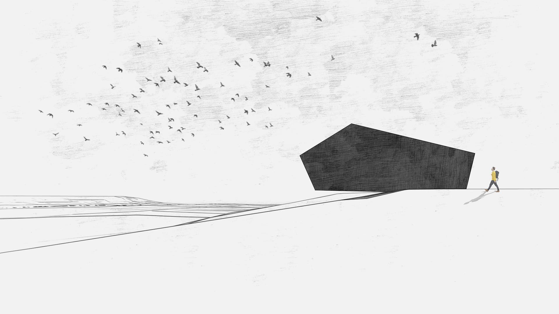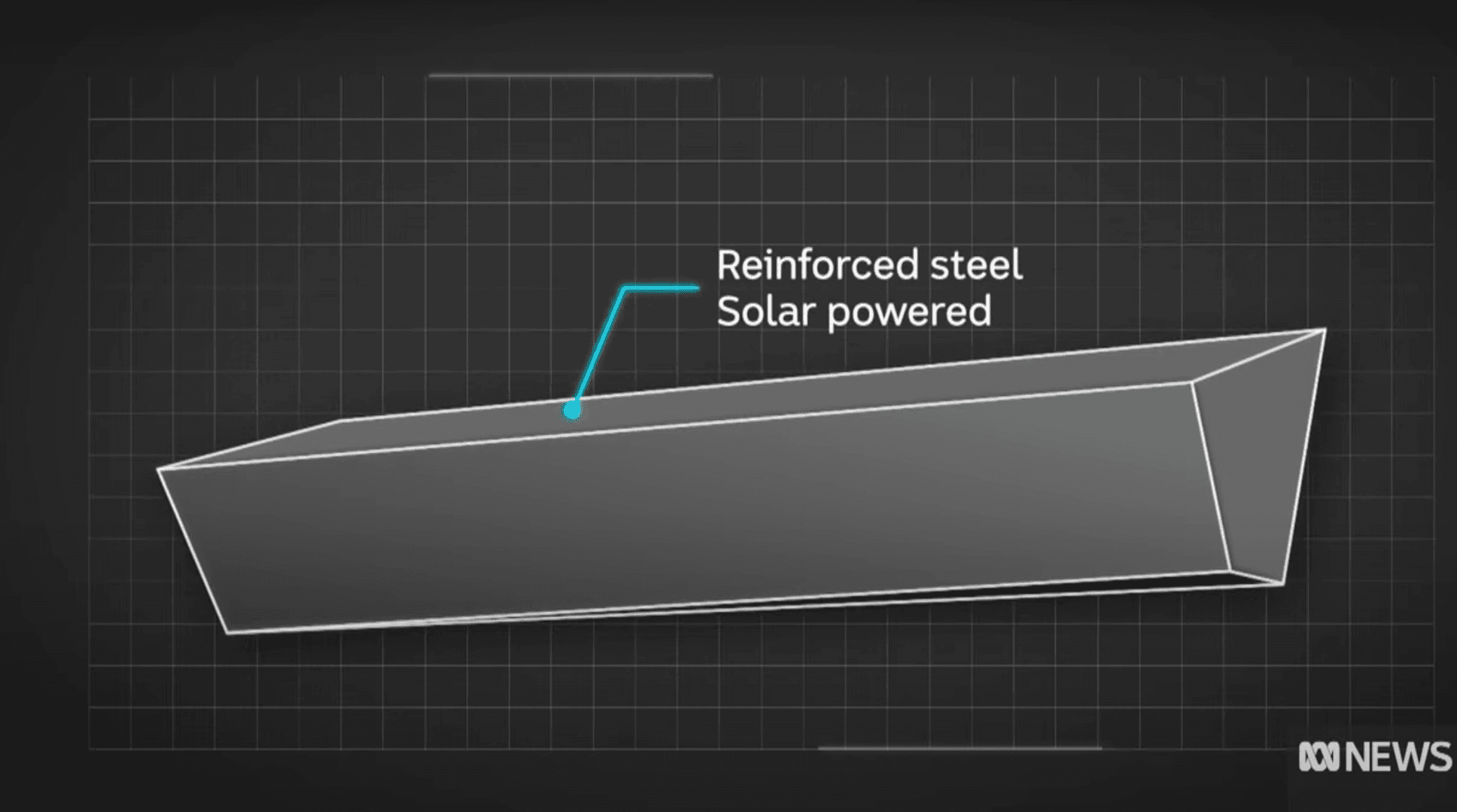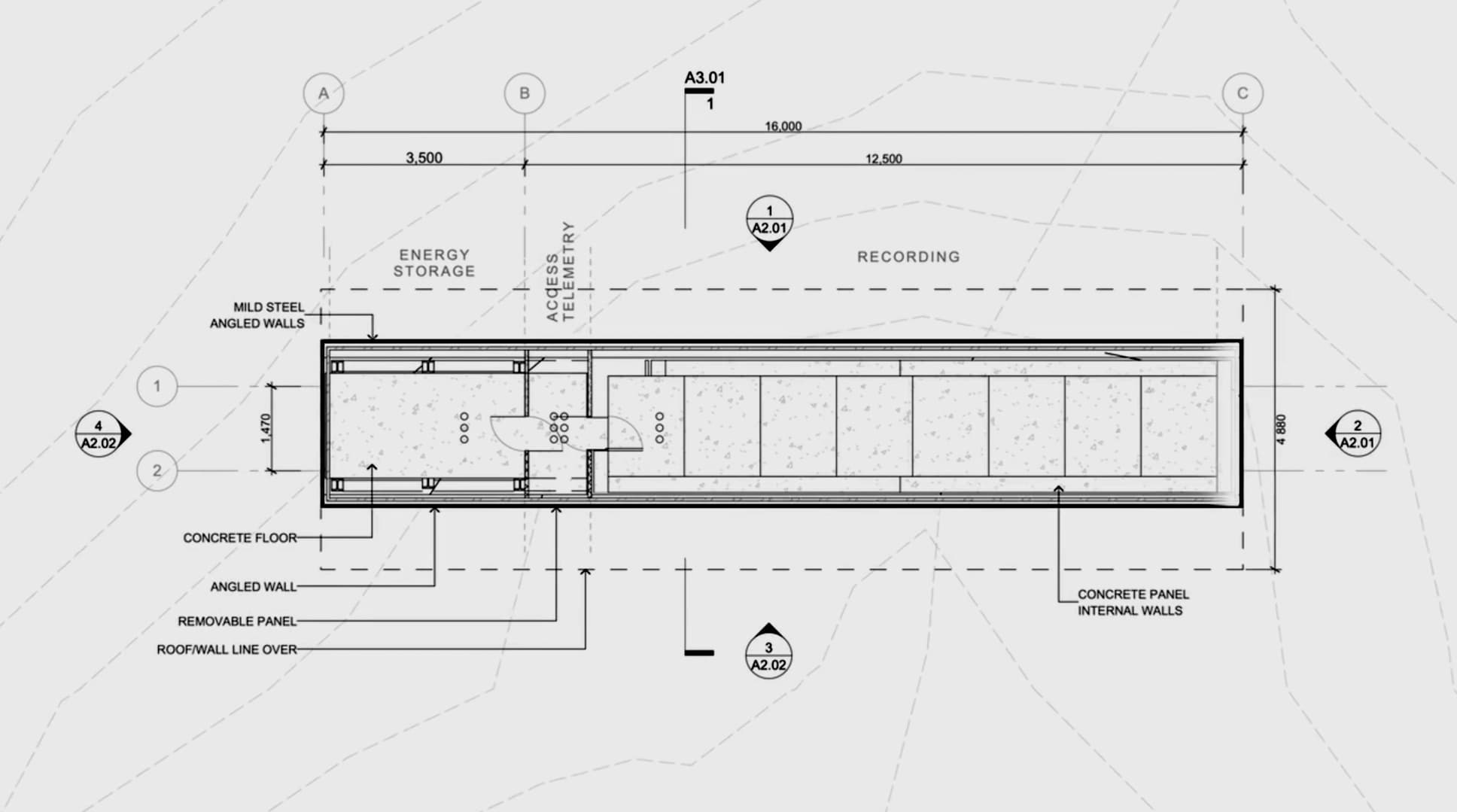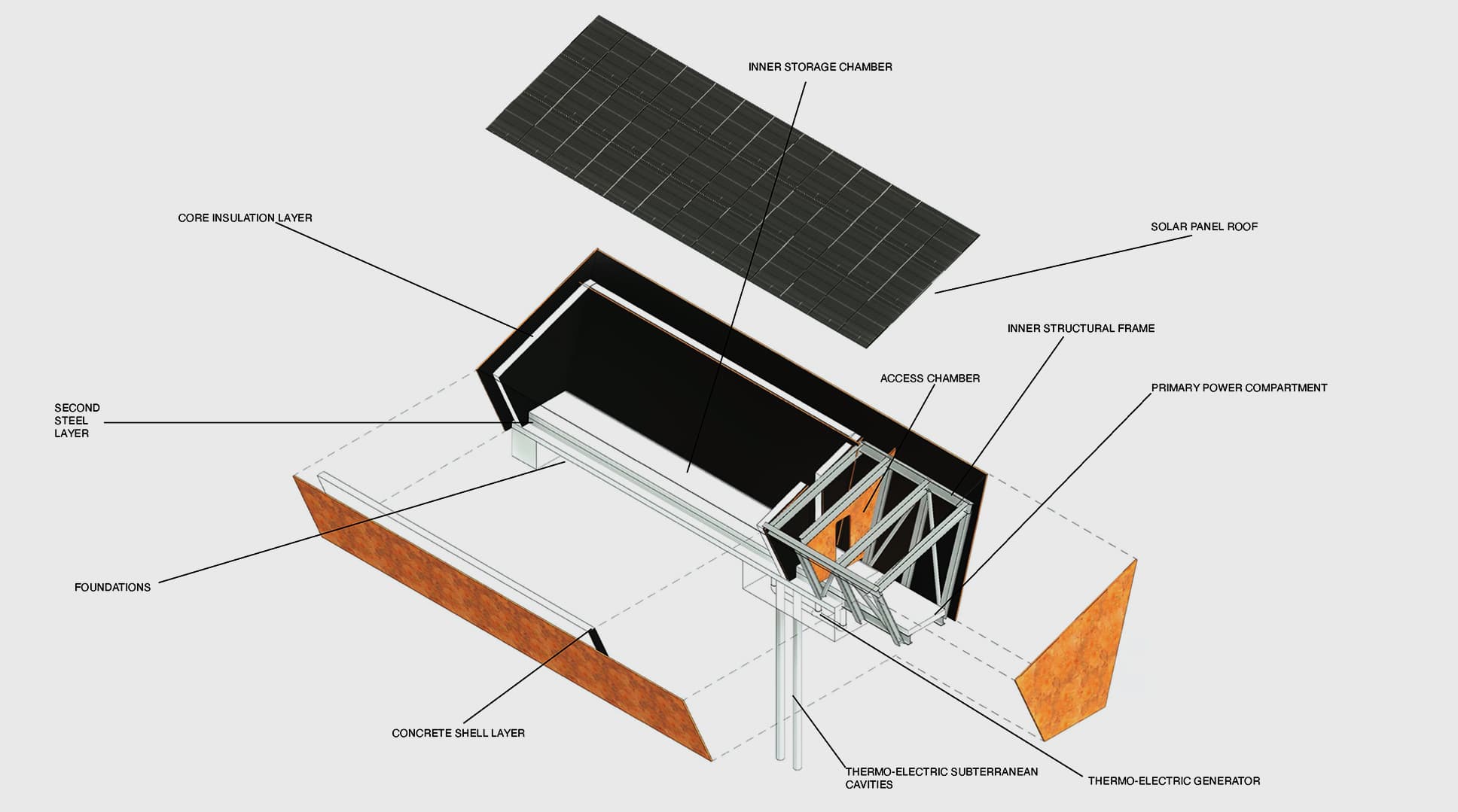 The steel and concrete structure will be 16m long, 4m high. The exterior layer of steel appears orange through an oxidization treatment. Inside is a data storage compartment, two power generation and storage compartments, and an access chamber. The structure is supported by reinforced foundations and has 15m vertical cavities in the granite beneath it for thermo-electric power generation. The roof has 36 solar panels protected by layers of toughened glass.
