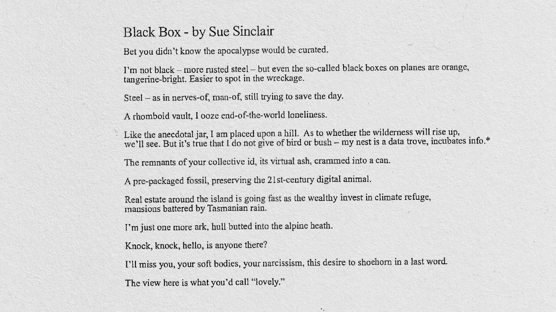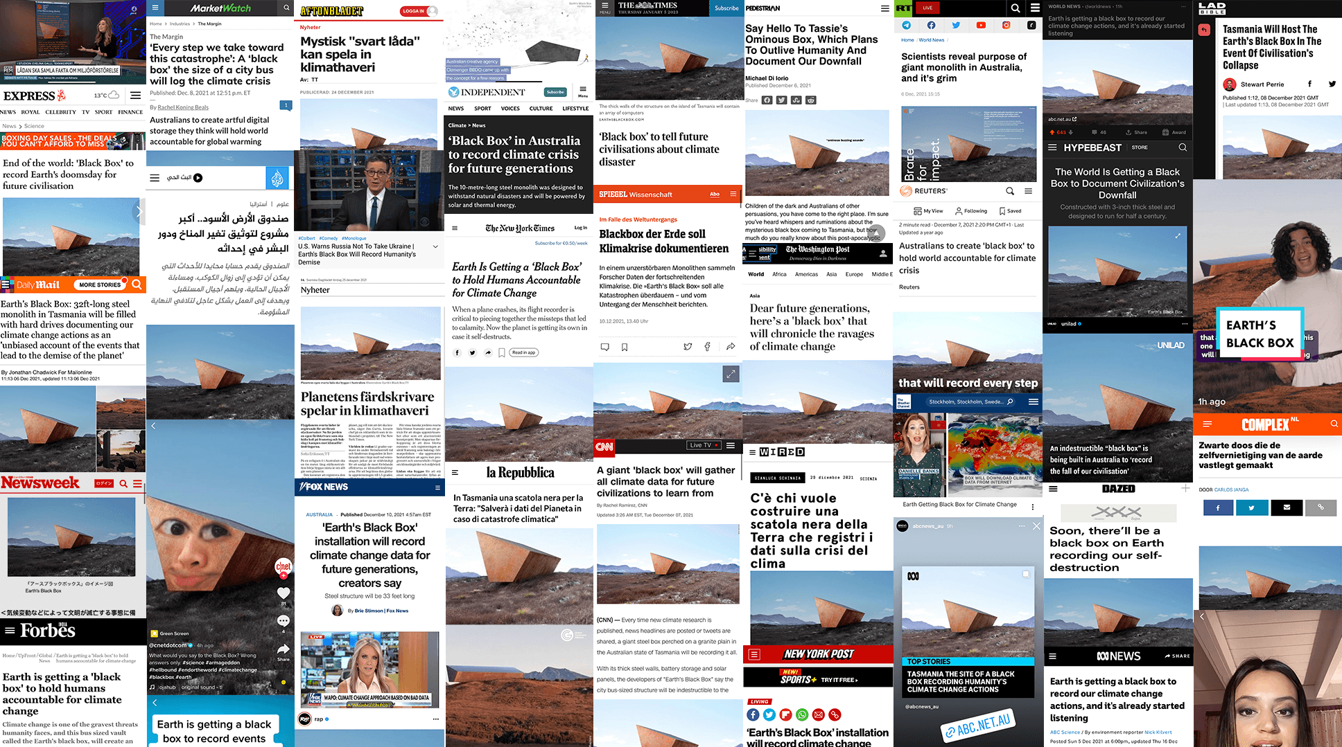 What started as a brief to raise awareness around the urgency of the climate crisis, became a collaborative art project by activists, artists, engineers and scientists. This decade will determine how the climate crisis unfolds. But if the worst were to happen, who will remain to tell our story? Earth's Black Box: an objective witness that records and stores the decisions that lead to a solution or a catastrophe. The box is already listening, and construction will be completed in the near future. Brought to life in collaboration with Revolver/Will O'Rourke, Glue Society, University of Tasmania, Rob Beamish, and Room11.