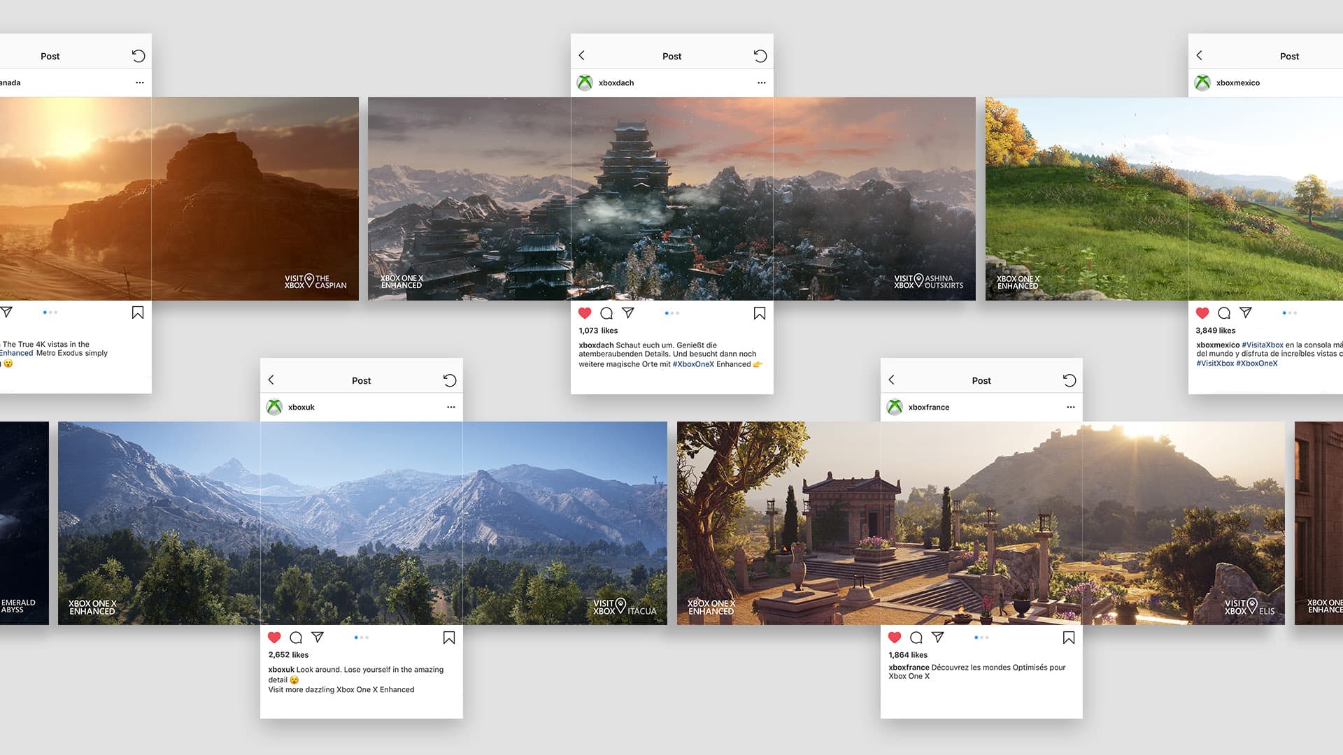 Xbox One X Enhanced games have more realistic graphics, higher resolution, and better frame rate. But instead of promoting Enhanced games using technical specs, we inspired the world to see games from a new perspective. Not as missions to be completed, but as destinations to be experienced. Collaborating with in-game location scouts and in-game photographers, we turned a gaming brand into a travel brand.
